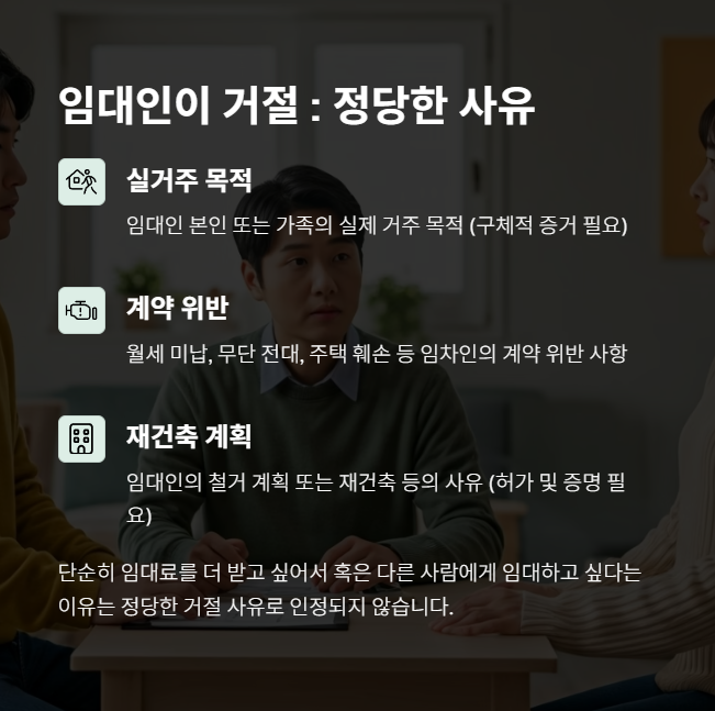임차인이 갱신청구권을 행사했더라도, 임대인이 법적으로 인정되는 정당한 사유가 있다면 갱신을 거절할 수 있습니다. 아래는 대표적인 거절 사유입니다: