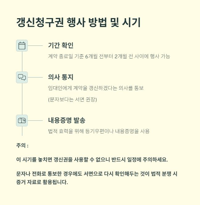 갱신청구권은 임대차 계약 종료일 기준 6개월 전부터 2개월 전까지 행사해야 합니다. 이 시기를 놓치면 갱신권을 사용할 수 없기 때문에 반드시 일정에 주의해야 합니다.
