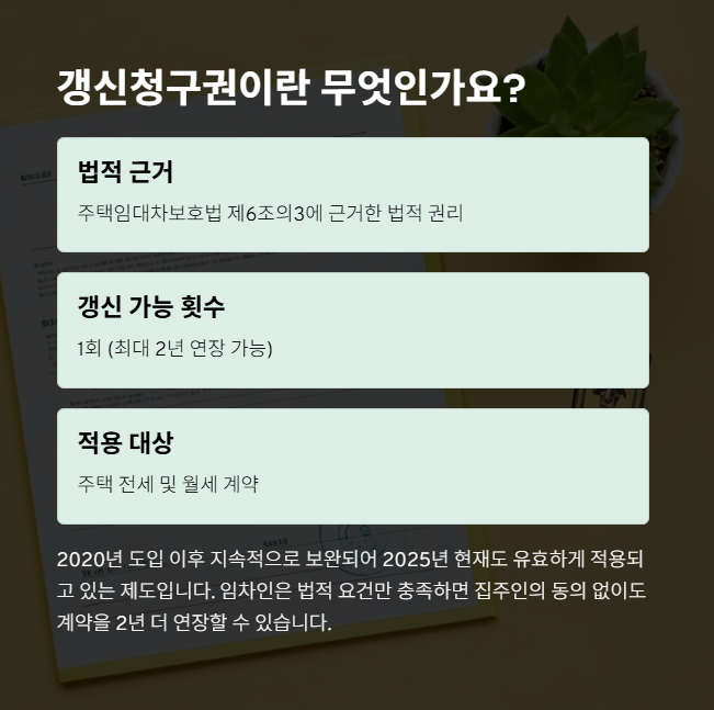 2025년 현재, 전세계약 갱신청구권은 임차인의 주거 안정을 위한 핵심 제도로 자리 잡고 있습니다. 계약 기간이 만료되었더라도 일정 조건을 충족하면 임차인이 계약 연장을 요구할 수 있는 이 권리는 많은 세입자에게 큰 힘이 됩니다. 이 글에서는 갱신청구권의 정의부터 행사 절차, 임대인의 거절 사유, 법적 대응 방법까지 구체적으로 안내드리겠습니다.
